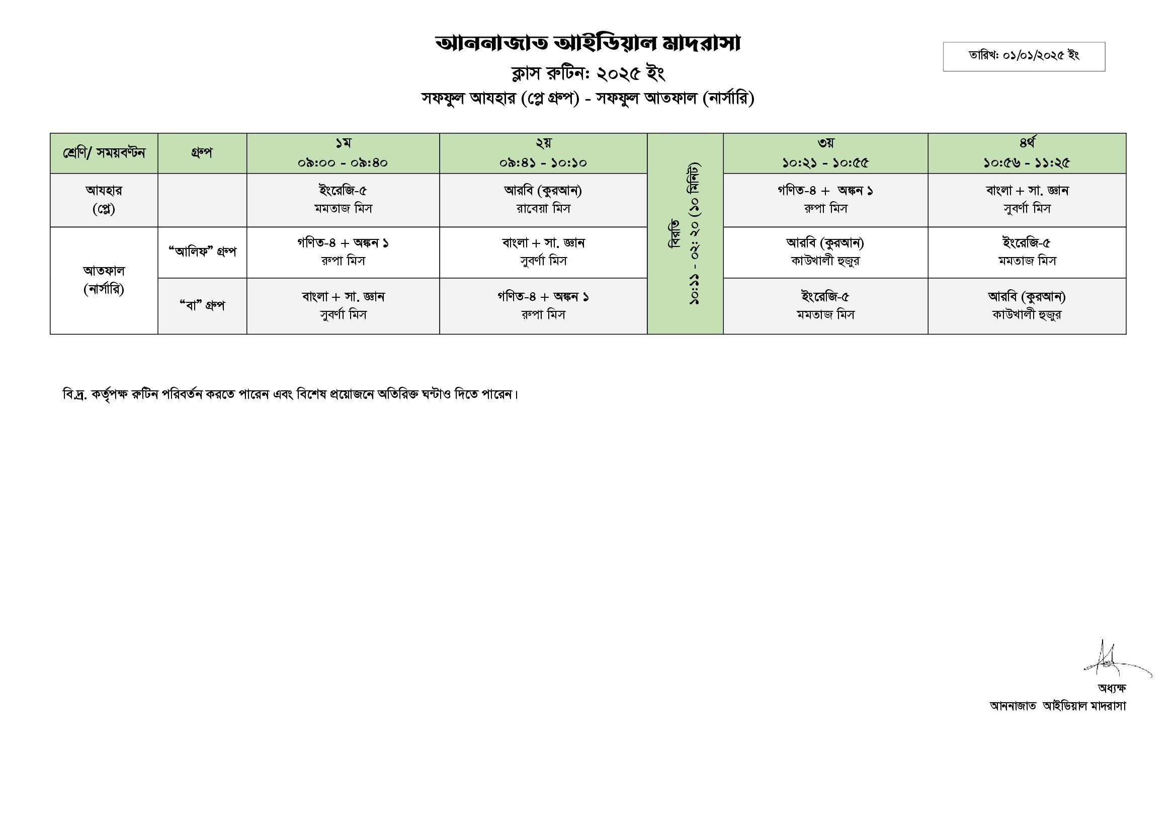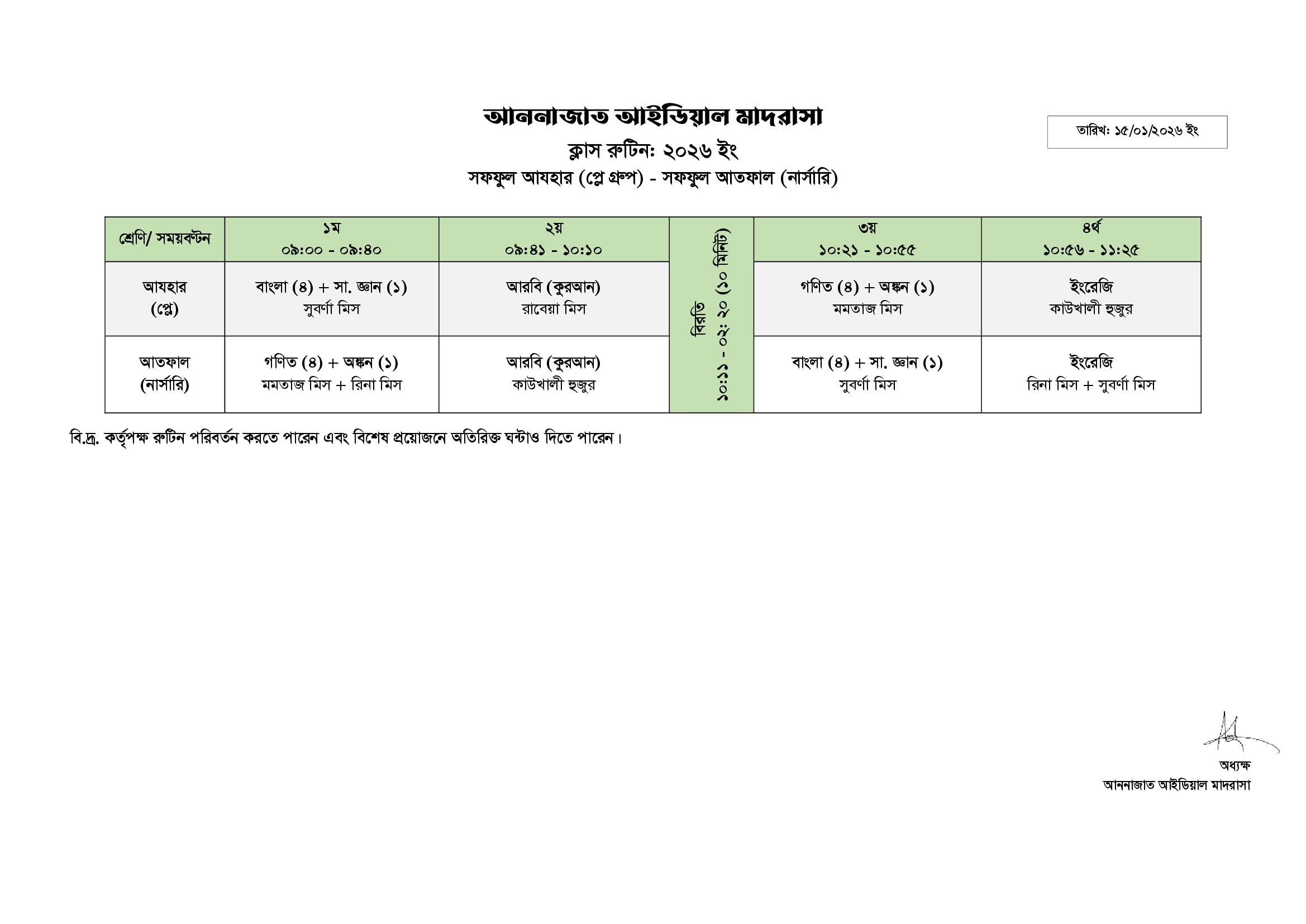 আযহার (প্লে গ্রুপ) - আতফাল (নার্সারি) এর ক্লাস রুটিন ২০২৬