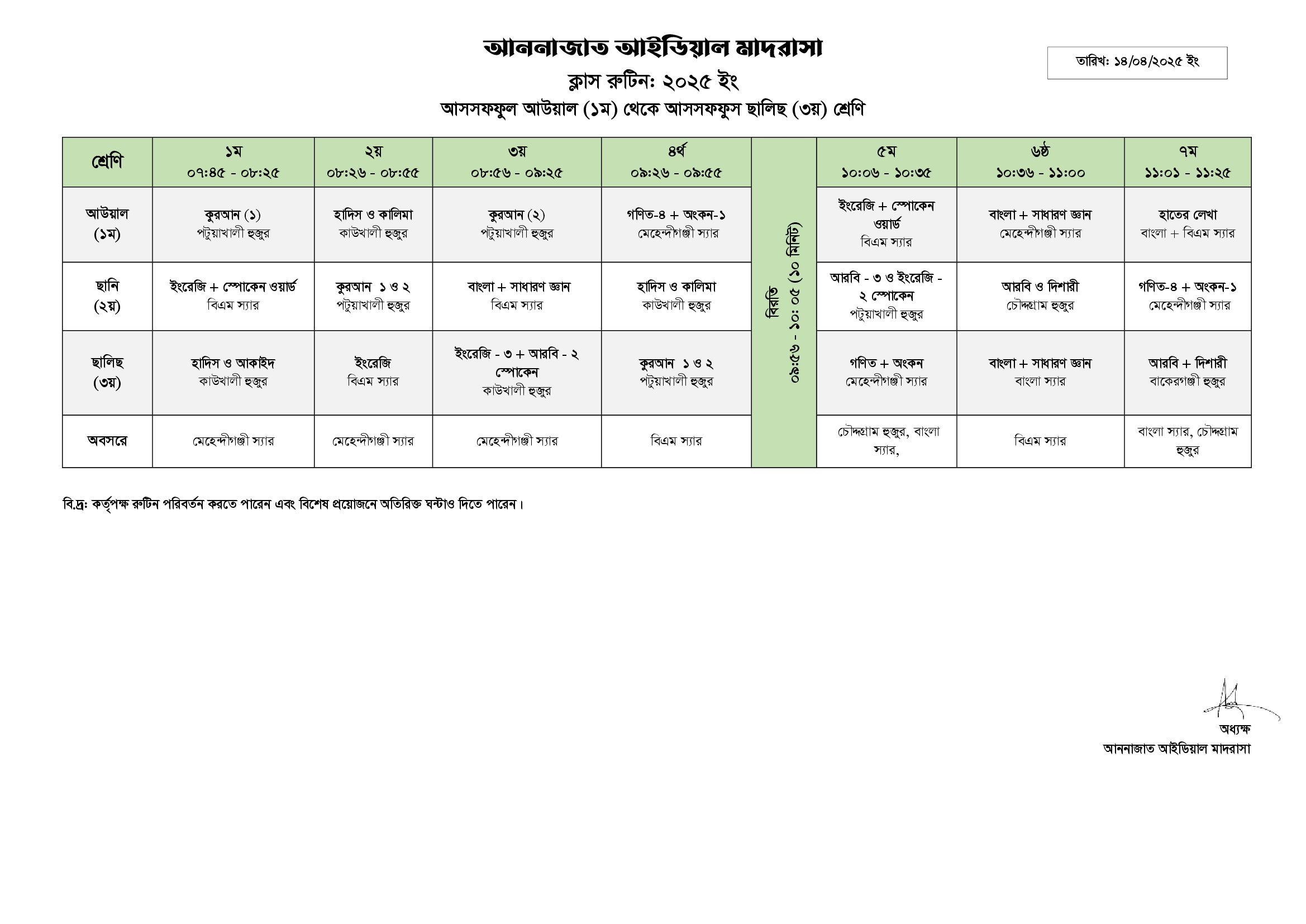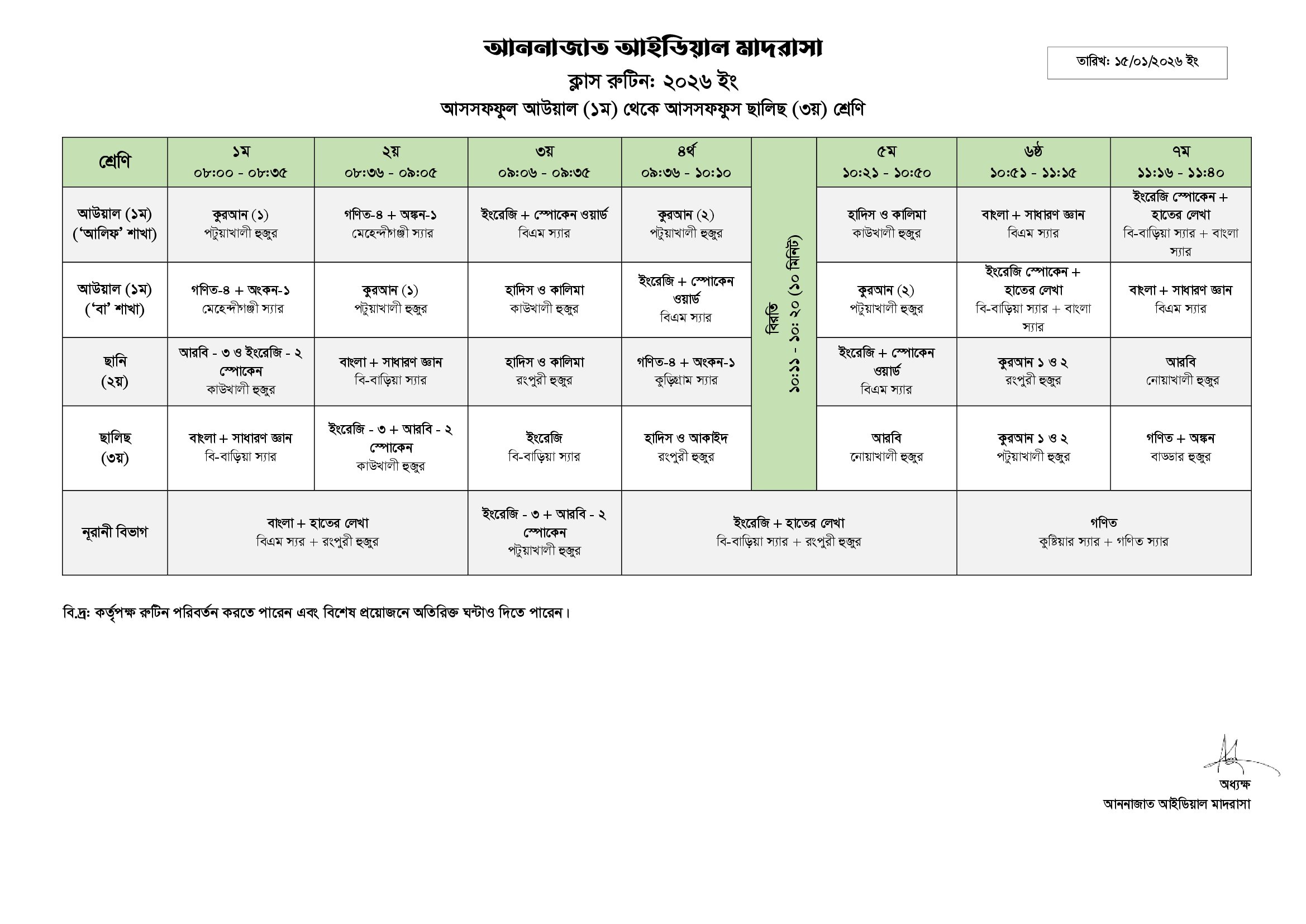আউয়াল (১ম শ্রেণি) থেকে ছালিছ (৩য় শ্রেণি) এবং নূরানী বিভাগের ক্লাস রুটিন ২০২৬