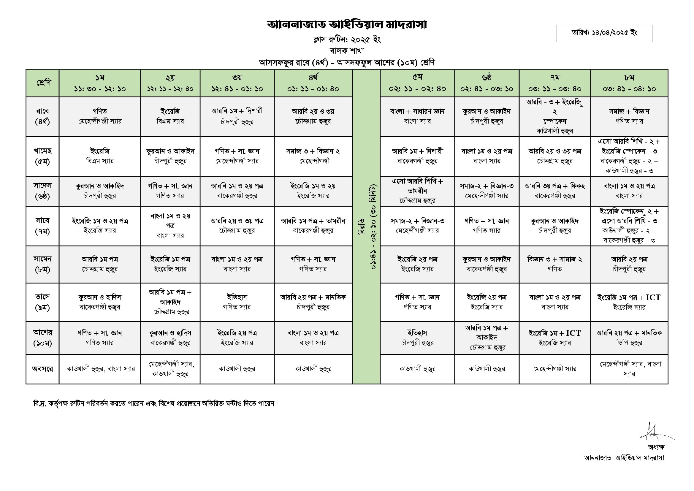 বালক শাখা: রাবে (৪র্থ শ্রেণি) থেকে আশের (১০ম শ্রেণি) এর ক্লাস রুটিন ২০২৬