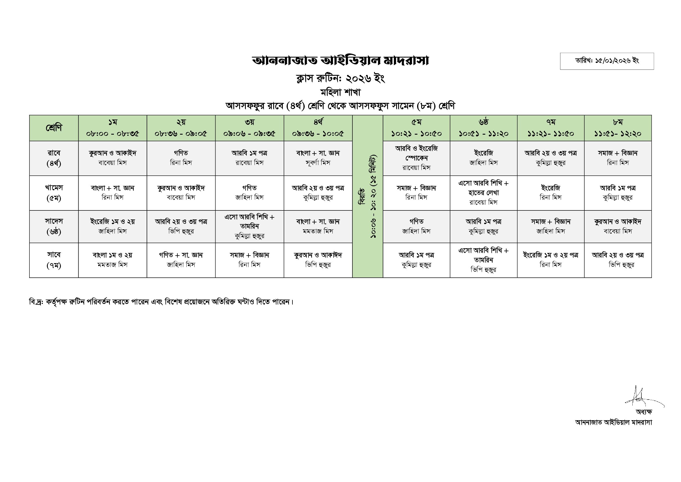 মহিলা শাখা: রাবে (৪র্থ শ্রেণি) থেকে সাবে (৭ম শ্রেণি) এর ক্লাস রুটিন ২০২৬